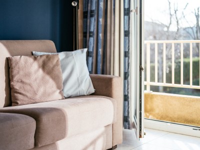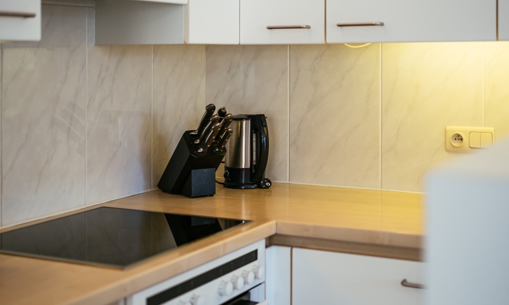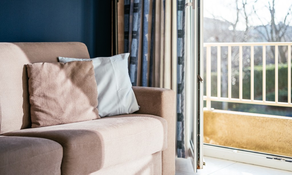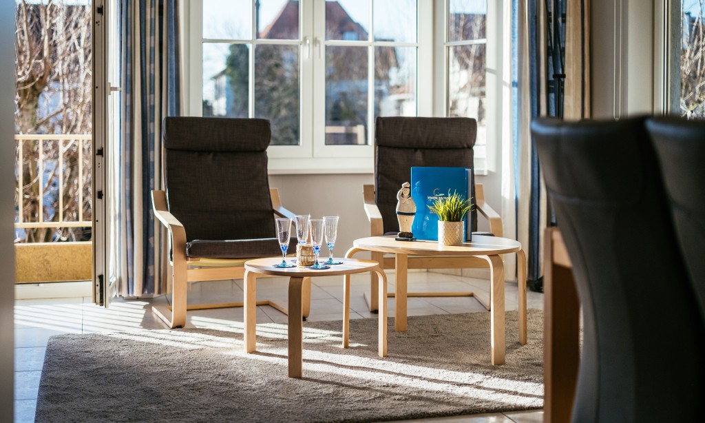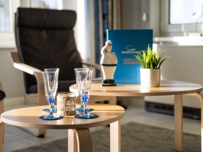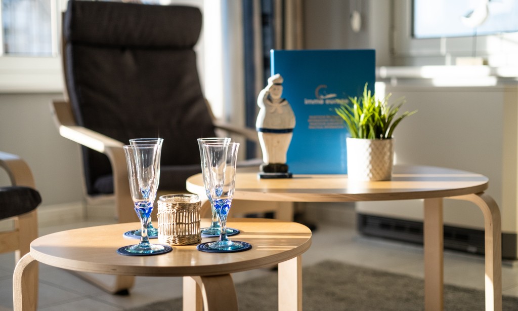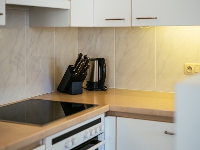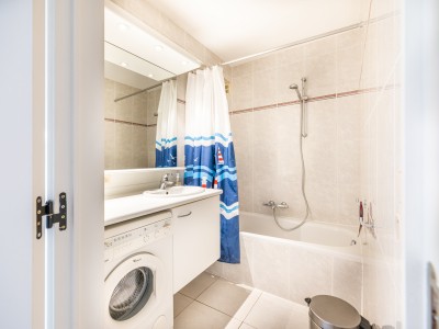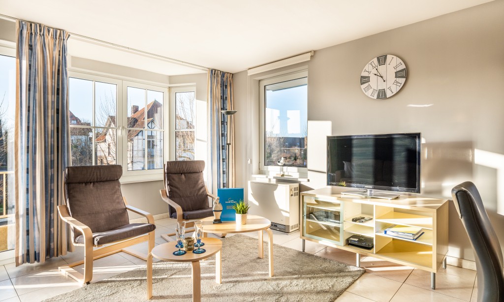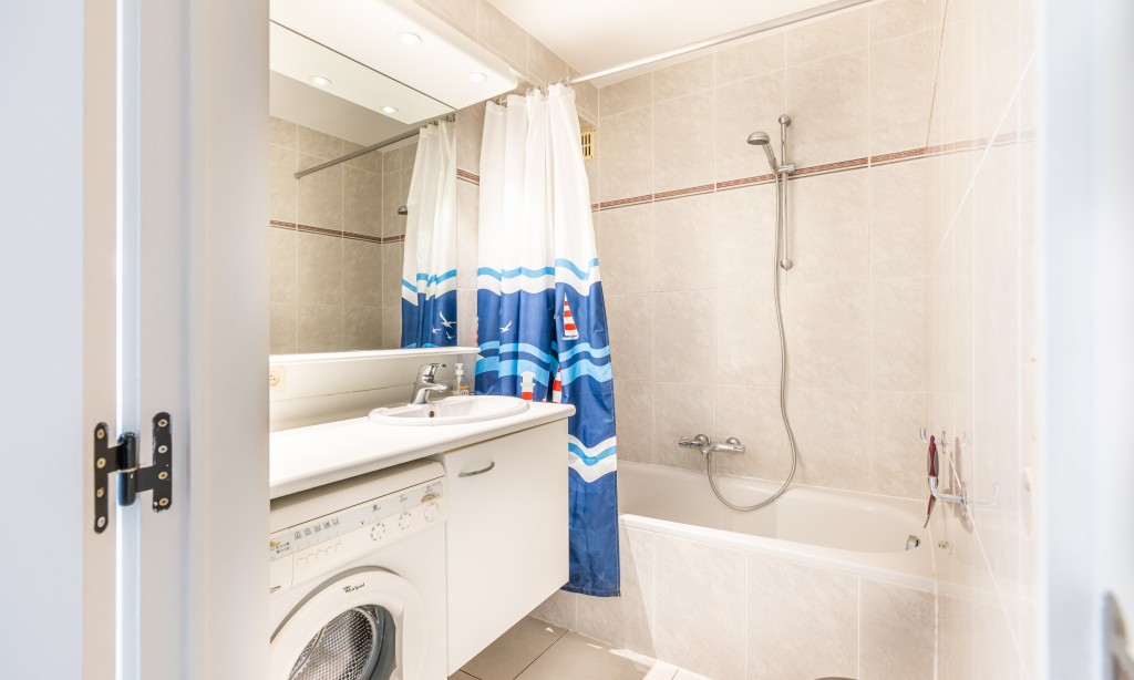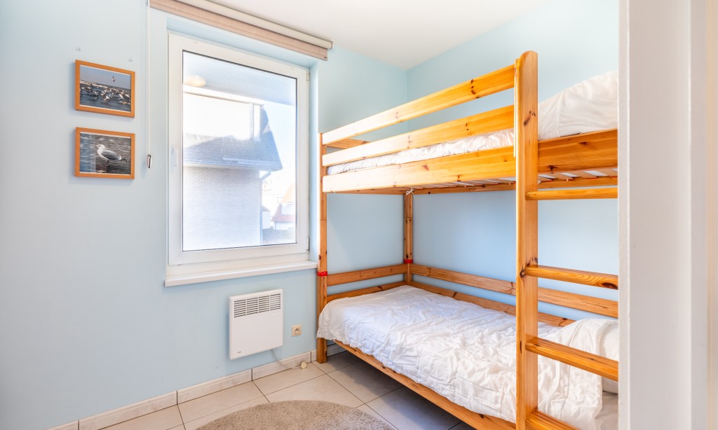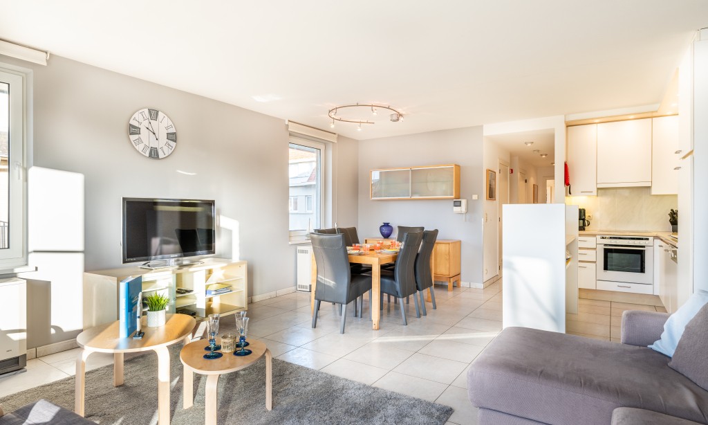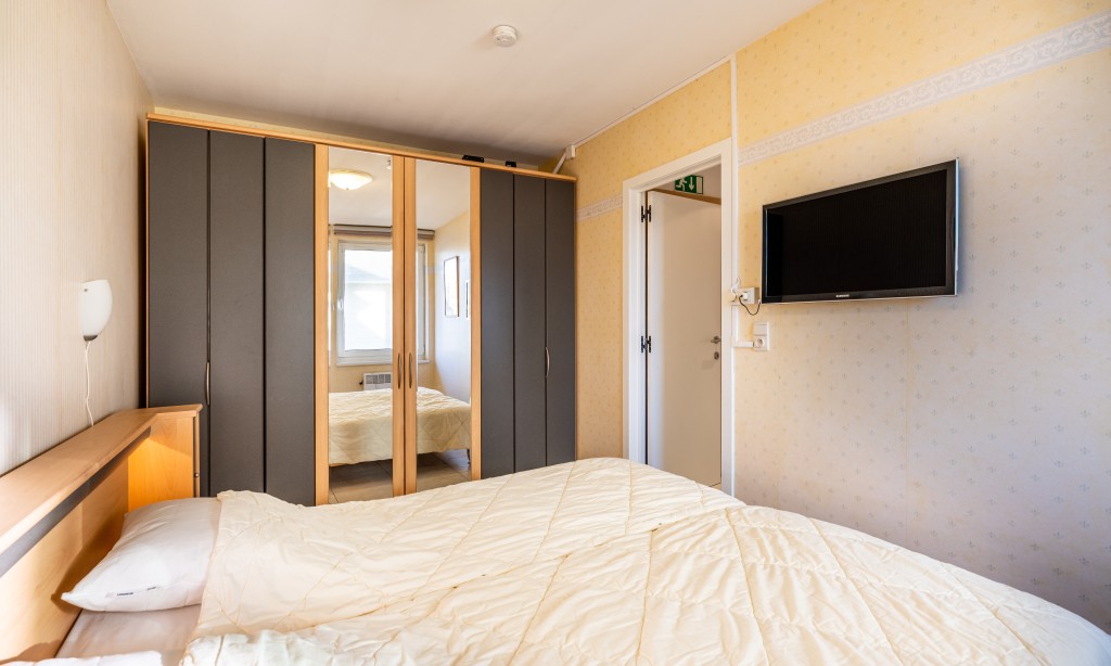 Sunny living room with modern furniture, 2 bedrooms with their own flat screen TV. Room with a double bed, one room with bunk beds. Super open kitchen, washing machine in the bathroom.
