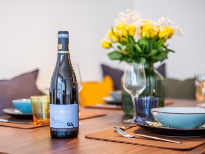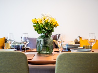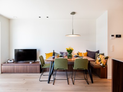 The flat consists of a sunny living room with integrated, stylish and modern fitted kitchen with dishwasher, combi-oven, spacious fridge, induction hob. Furthermore, a dining table for 6 with cosy sofa and 2 extra bar stools at the kitchen table. There is a handy storage room, a bathroom with walk-in shower and washbasin, separate toilet, a bedroom with a double box spring, a bedroom with 2 single box spring beds. A total of 4 people can stay overnight. Sunny balcony at the front with 2 lounge chairs and a table, also a balcony at the bedrooms.