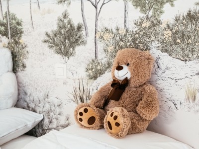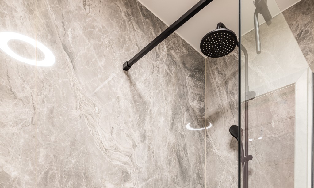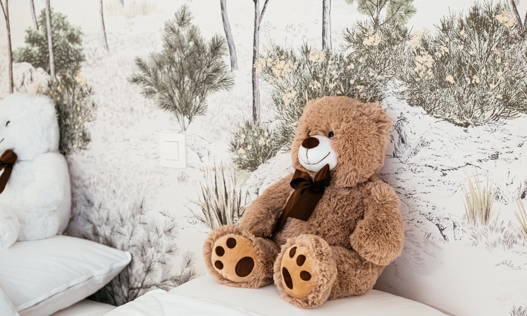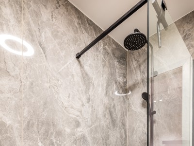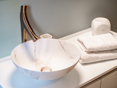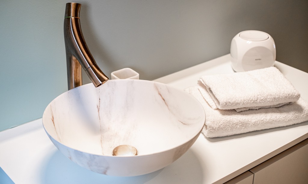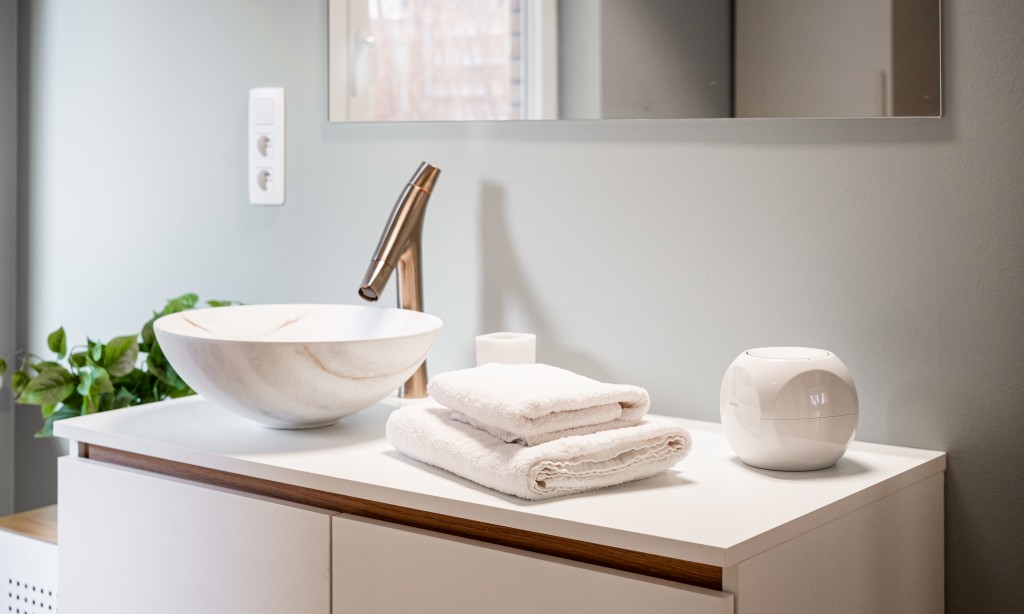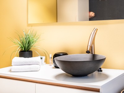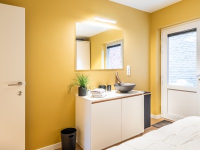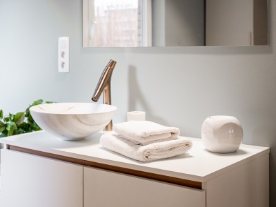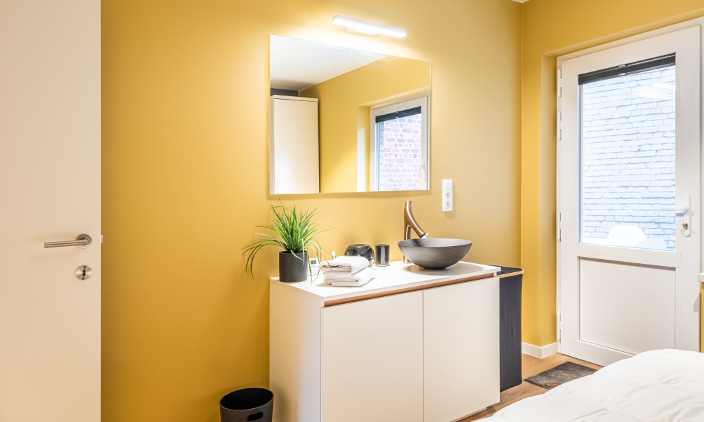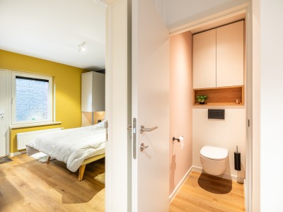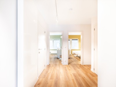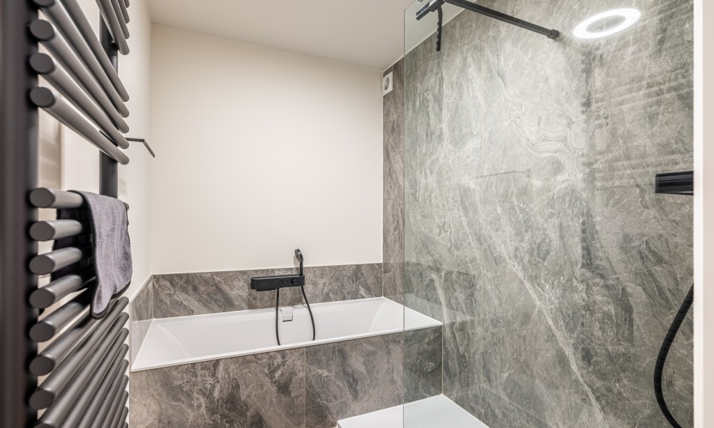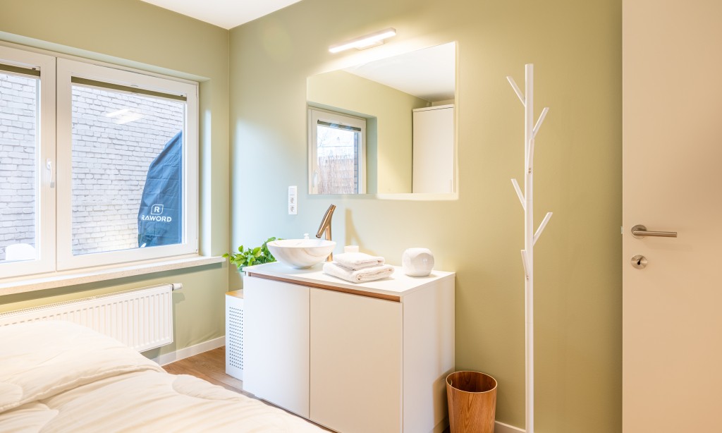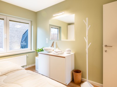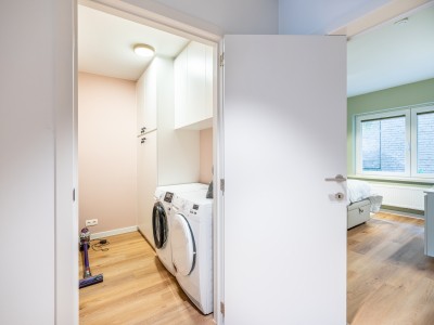 The apartment consists of a hallway, a bathroom with a walk-in shower and a bathtub for two people, a laundry room with a washing machine, dryer, and drying rack, a separate toilet, two bedrooms, one with a double bed and the other with two single beds. Each bedroom has a washbasin and a large mirror.