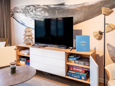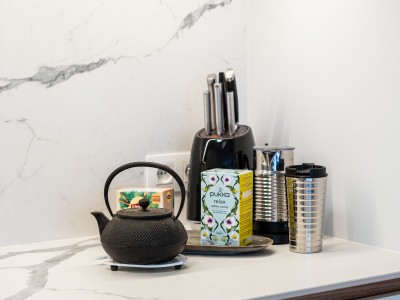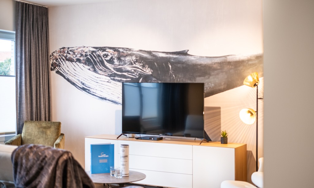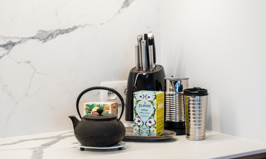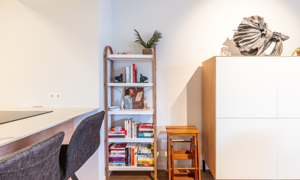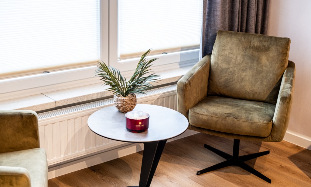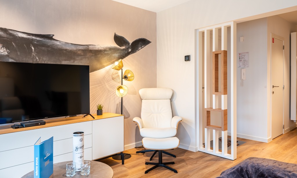 For more privacy, the apartment is equipped with electric shutters, curtains, and Luxaflex.