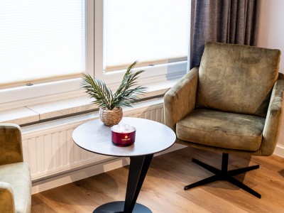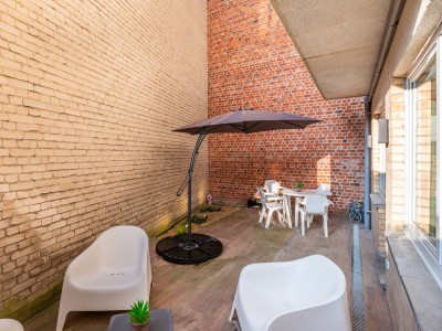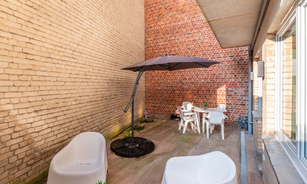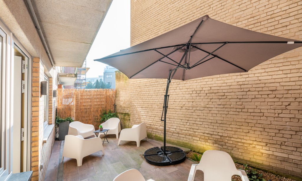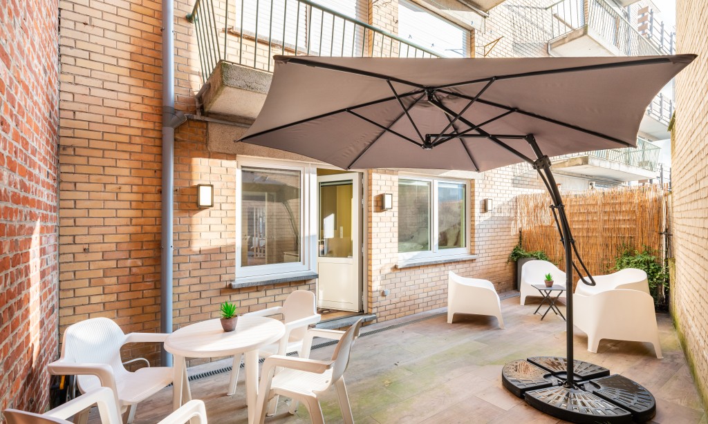 At the back of the apartment, there is a closed courtyard with garden furniture (table + chairs and lounge set), a large parasol, and illuminated flower beds.