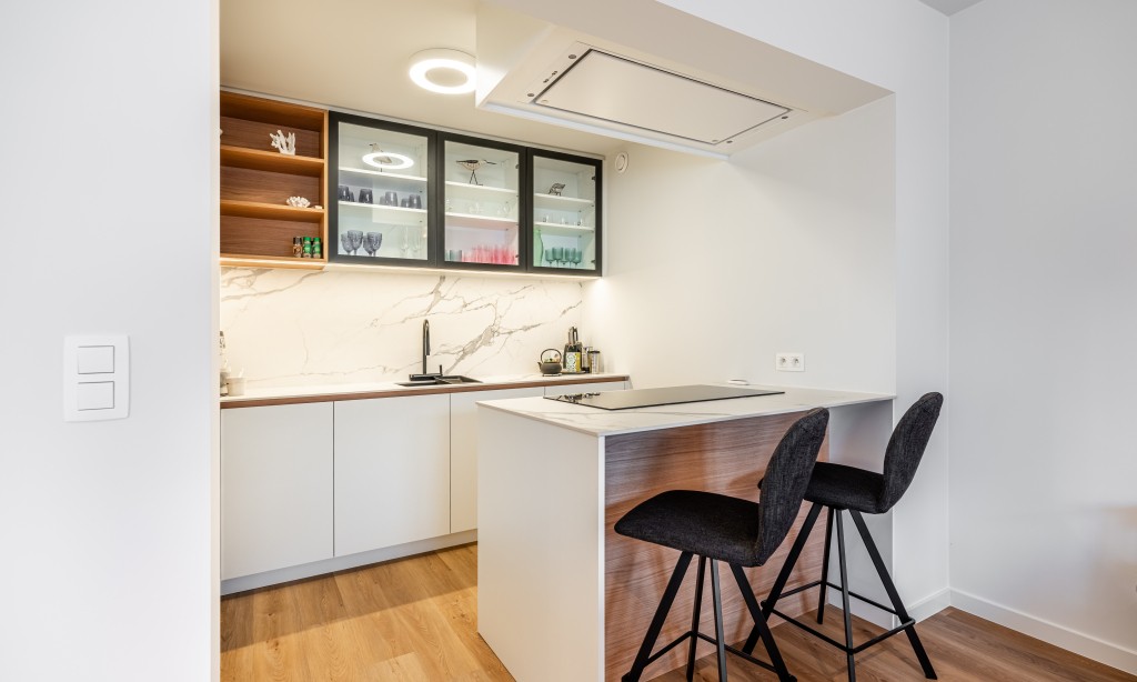 The living room consists of a television, a floor lamp, two coffee tables, an electric two-seater sofa, a reclining armchair with a footrest, and two individual armchairs. The dining room and kitchen consist of a floor lamp, a table (extendable) with 4 chairs, two bar stools, an induction stove, a hood with remote control, a combined microwave oven, and a dishwasher.