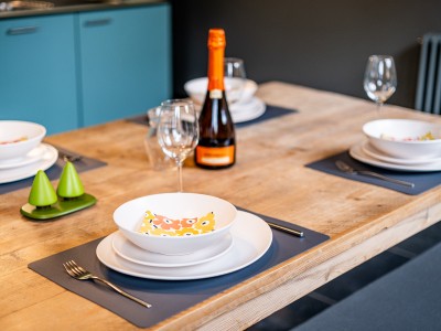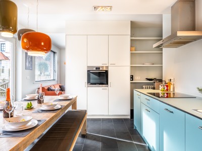 The apartment consists of an open kitchen with dishwasher, oven, ceramic hob, large refrigerator with freezer compartment. In the kitchen, there is a large table with benches. There is a separate spacious living room, a bedroom with double bed with its own bathroom with shower and toilet, a bedroom with bunk beds, a bedroom with 2 single beds, a separate toilet, and a second bathroom with shower and sinks.