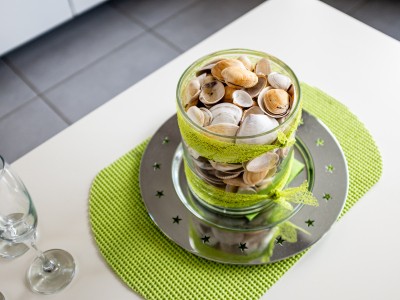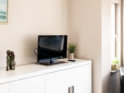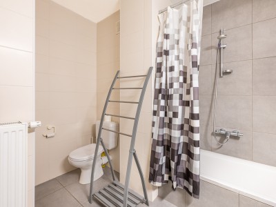 Spacious hall, sunny living/dining room with divan, 2 club chairs and 1 electric relax chair, table with 4 chairs (extendable for 6 people) modern fitted kitchen with dishwasher, oven, microwave, fridge with freezer drawer. The family bathroom is equipped with a sink, a toilet and a bathtub. There are 2 bedrooms. Bedroom with double bed (200x180) and a 2nd bedroom for 4 people with two bunk beds (90x200). There is also a parking space for 1 car and private terrace at street level at the back of the building.