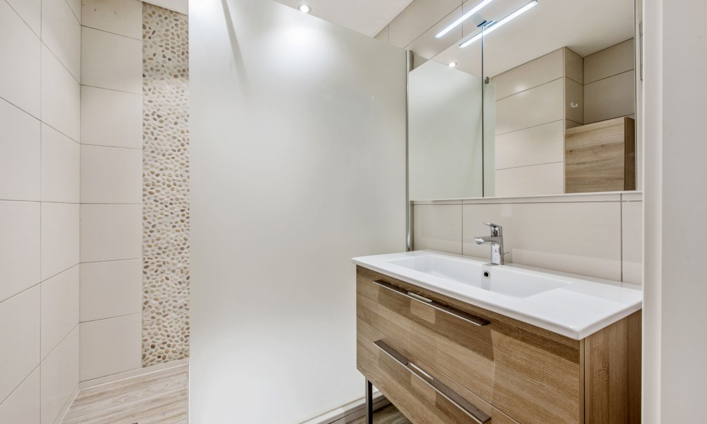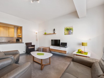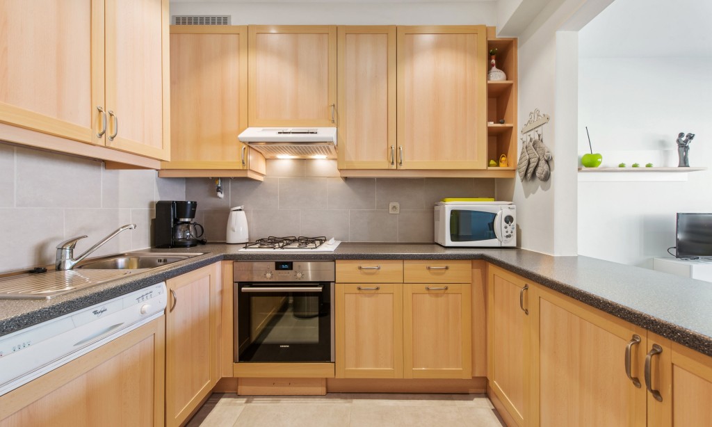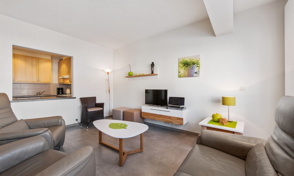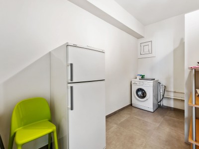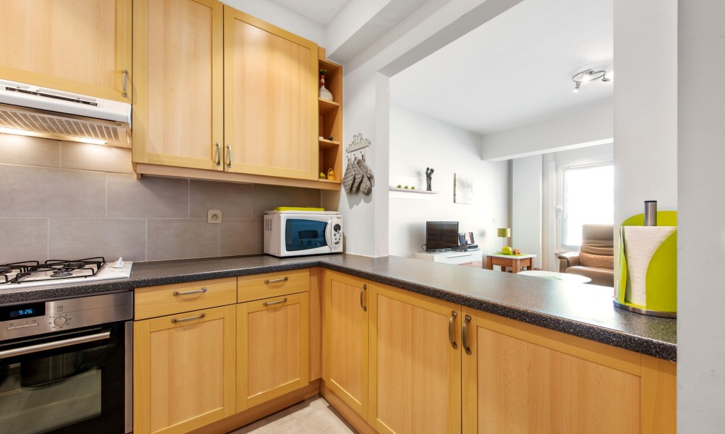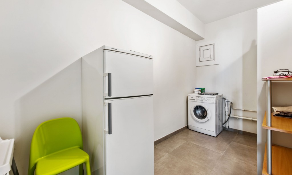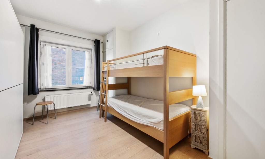 This apartment consists of a hall, toilet, large storage room, living room, separate fitted kitchen, bathroom with washing machine, bedroom with double bed, bedroom with a 2 bunk bed (1 fixed bunk bed and 1 fold-up bunk bed).