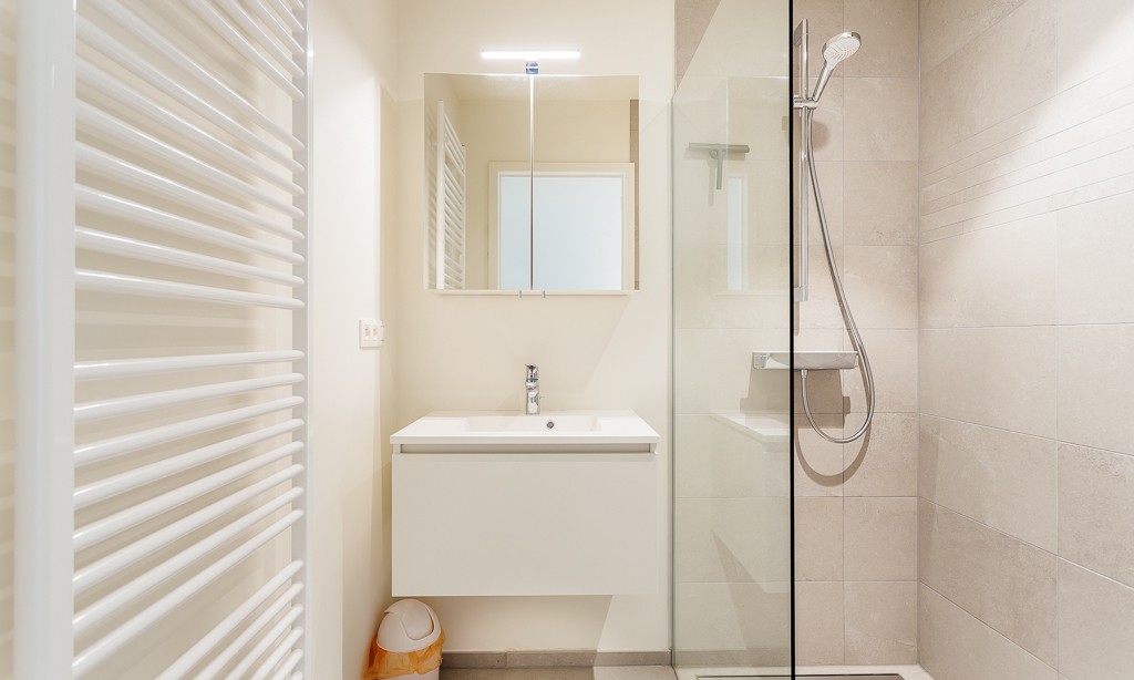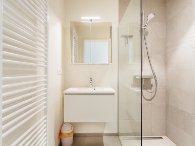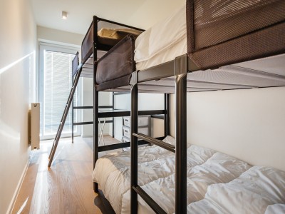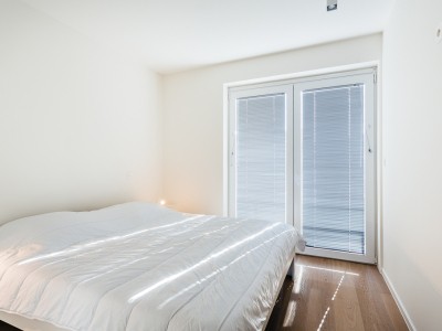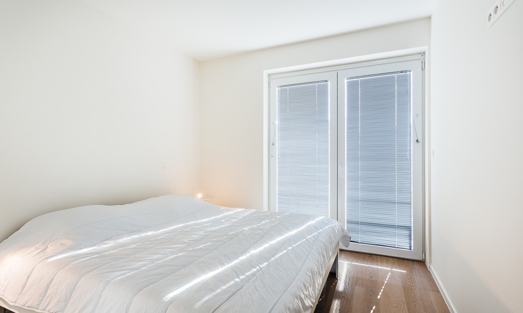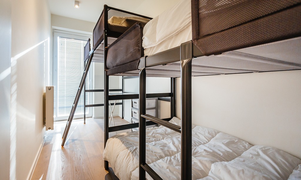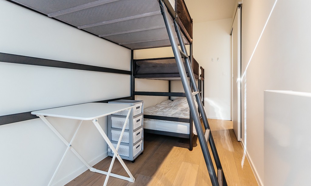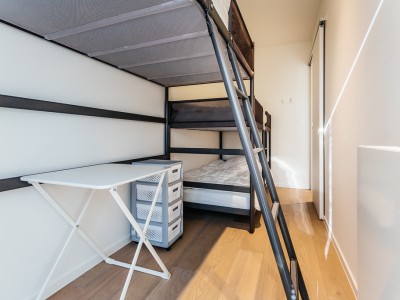 Living room with integrated, modern fitted kitchen with all comfort, bathroom with walk-in shower, separate toilet, a bedroom with a double bed, a bedroom with bunk beds and high sleeper or study place. Balcony on the sea side. Balcony to the bedrooms.
