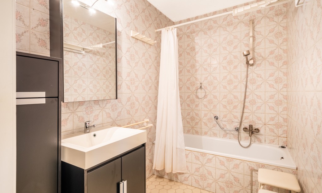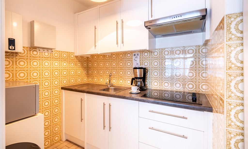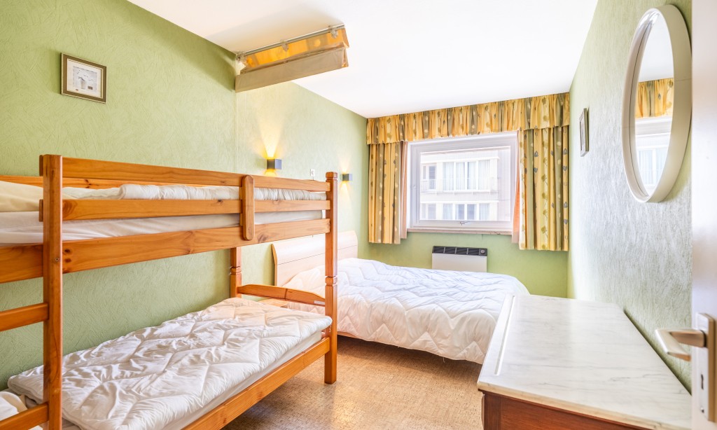 Hall, toilet, living room with side sea view, balcony, separate fitted kitchen, bathroom with bath, 1 large bedroom with 1 double bed and 1 bunk bed.