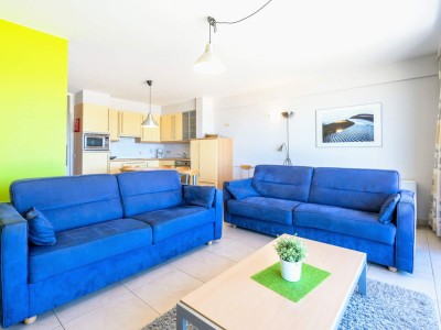 The apartment consists of a living room with balcony and sea views, open and fully equipped kitchen. A bedroom with double bed and its own shower room, a 2nd bed room with 2 single beds. Bathroom with bath and shower, separate toilet.