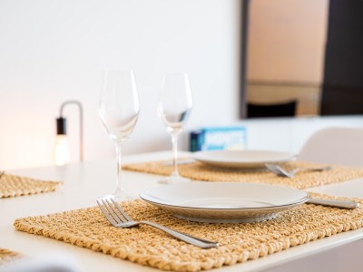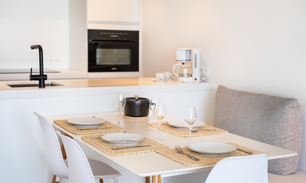 Living room with integrated, modern fitted kitchen with all comforts, bathroom with walk-in shower, separate toilet, one bedroom with double bed, one bedroom with bunk bed. Balcony on the sea side and balcony on the bedrooms.