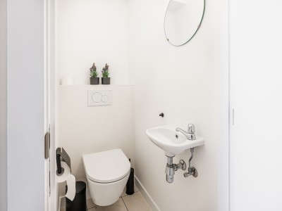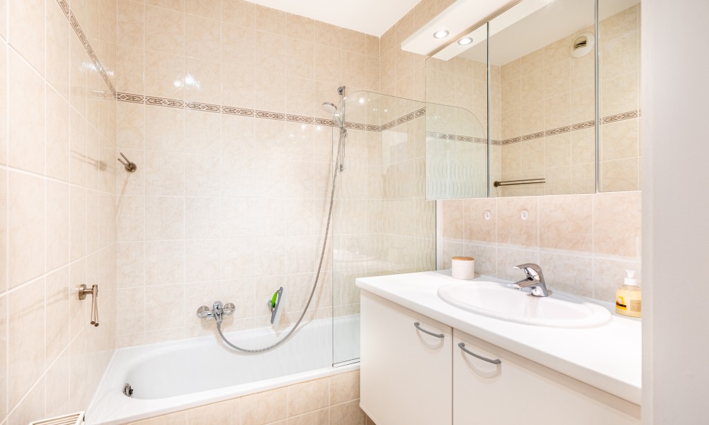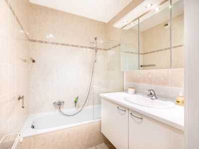 This flat comprises a hall, toilet, bedroom with double bed, bathroom with bath and shower enclosure, open-plan fitted kitchen ( dishwasher/classical oven/microwave/induction hob/fridge without freezer compartment), a sunny living room with sitting area/vanity bed, digital TV, a storage room and a south-facing balcony with 2 chairs and a bistro table.