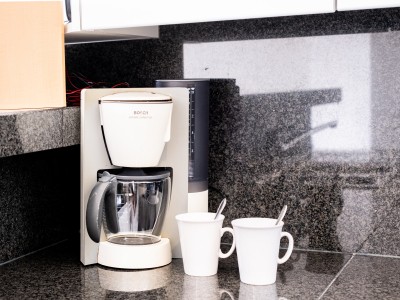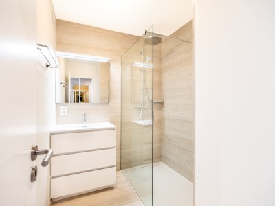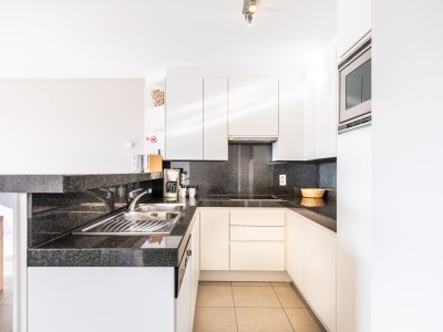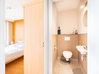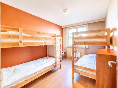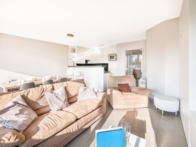 Sunny living room with access to the balcony, open plan fitted kitchen, toilet, bathroom with bath and glass shower wall, bedroom with double bed, bedroom with 2 bunkbeds, parking space included.
