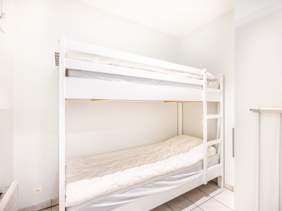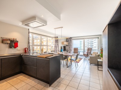 The modern apartment consists of a hallway, a bathroom with walk-in shower and a unit with 2 sinks, a separate toilet from the bathroom. There is a bedroom with a bunk bed and a large wardrobe, 2 bedrooms with double beds and wardrobes. The living room has a fully equipped open kitchen with refrigerator, 2 freezer drawers, convection oven, microwave, Nespresso, SodaStream, ceramic hob, and dishwasher. Table and chairs for 8 people, 3-seater sofa, 2 reclining chairs. Flat-screen TV with digital channels and Proximus wifi. There is a balcony with a view of the dike and 2 garden chairs. Garage 6 (closed box) included in Res. Zuidkant and electric heating with accumulation in the living room and electric convector heaters in the other rooms, boiler for hot water.