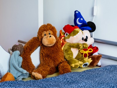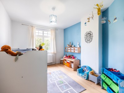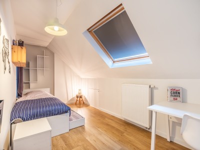 1 large bedroom with a double bed and desk, 1 bedroom with a single bed and trundle bed, as well as a desk. On this floor, there is also a toilet in the night hall.