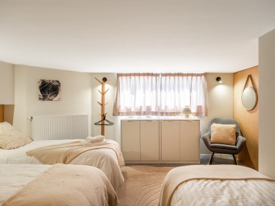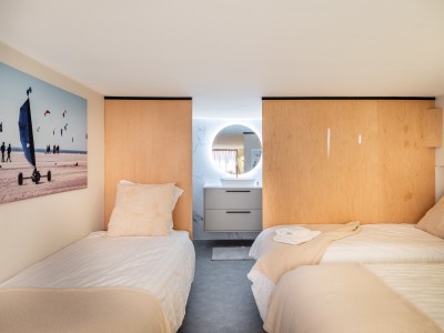 Spacious bedroom with 4 single beds, bathroom with bath and washbasin