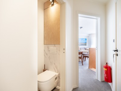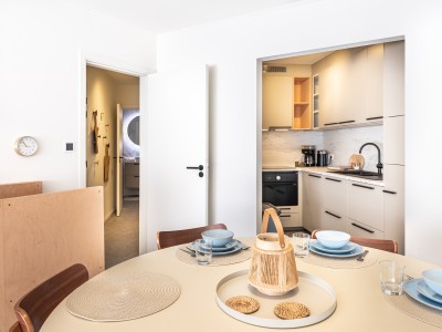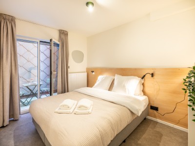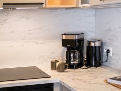 Separate entrance. Living room with lots of light; nice sitting area and pleasant round table, kitchenette with induction hob, combination microwave, spacious refrigerator with separate freezer for ice cream/soup/pizza, etc., separate toilet, bedroom with double bed and access to the courtyard, bathroom with walk-in shower and washbasin.