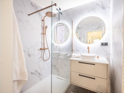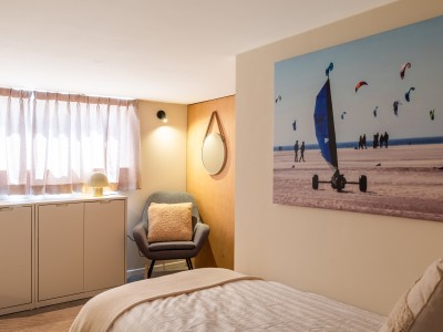 Beautifully renovated apartment with 2 bedrooms and 2 bathrooms, just 1 minute from the sea. The beletage/mezzanine consists of a ground floor with a courtyard at the rear and a lower floor with a large bedroom (4 persons) and a second bathroom. Very tastefully decorated and equipped with all comforts. There is WiFi, pets are not allowed.