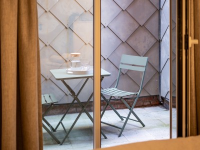 Small private courtyard accessible via the bedroom with bistro table and 2 chairs and large round picnic table for 6 people just in front of the residence (photo)