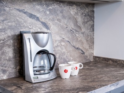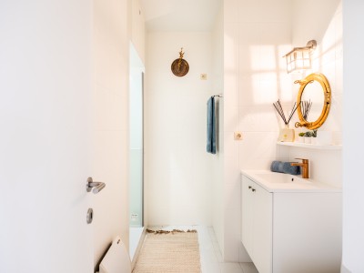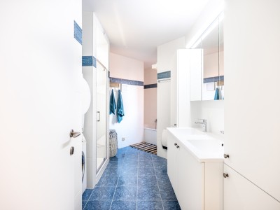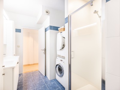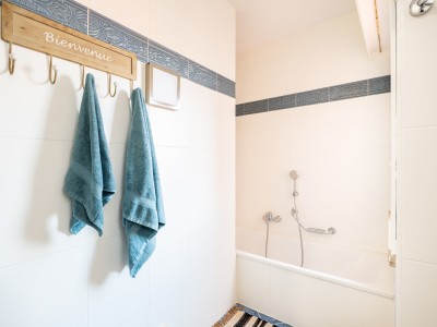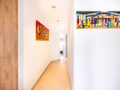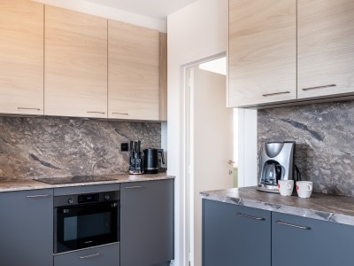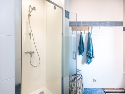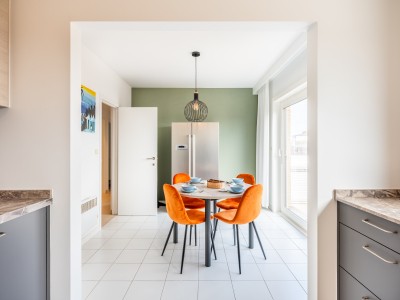 This spacious apartment consists of a hall, large dining room - living room with designer furniture, access to the terrace, reading corner in the living room. The separate kitchen with dishwasher, combination microwave, electric hob and American fridge also has a dining area for 4 people. From the kitchen you can also access the terrace and enjoy your breakfast outside. There are 3 bedrooms. One room with a bunk bed and 1 single bed (90x200, 3 single duvets 140x200), one bedroom with a double bed, one bedroom with a double bed and a baby bed with a raised base equipped with a mattress, pillow and duvet. There is one separate toilet, one toilet in the bathroom, one bathroom with shower, and one bathroom with bath and shower.