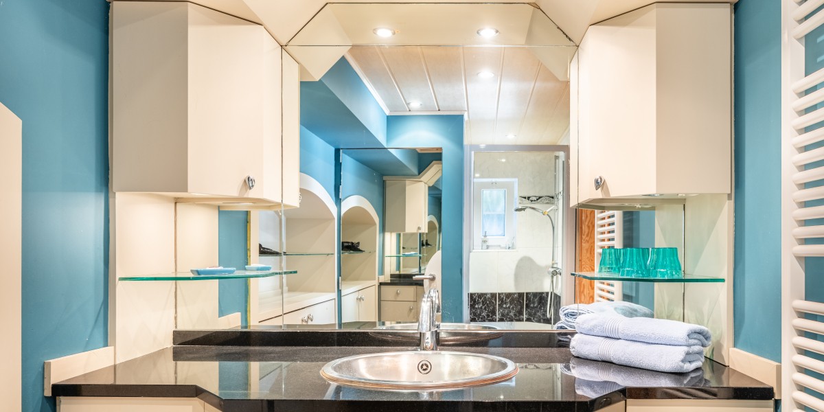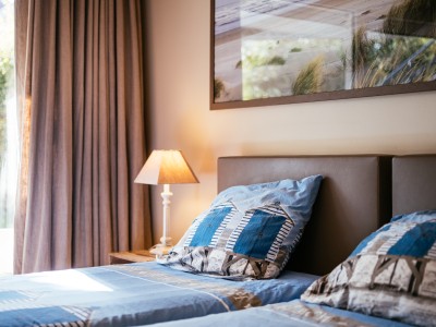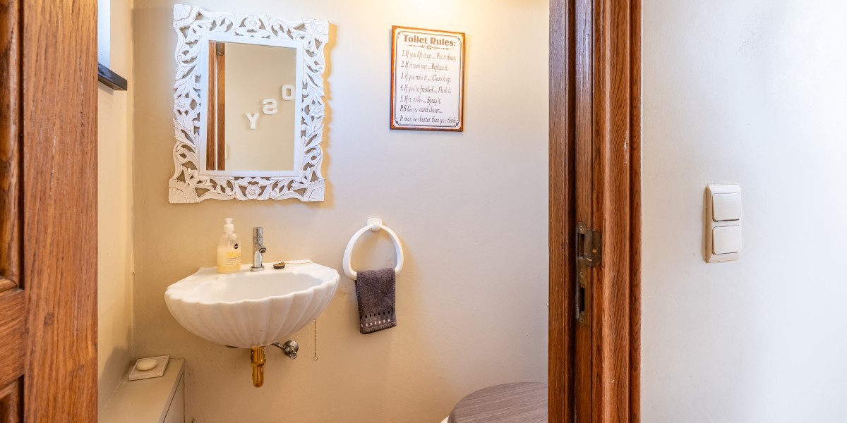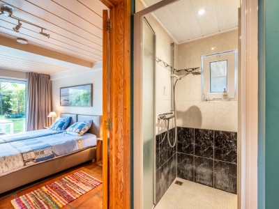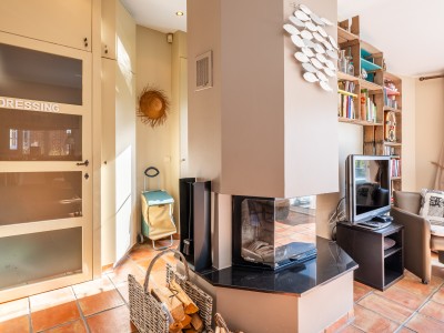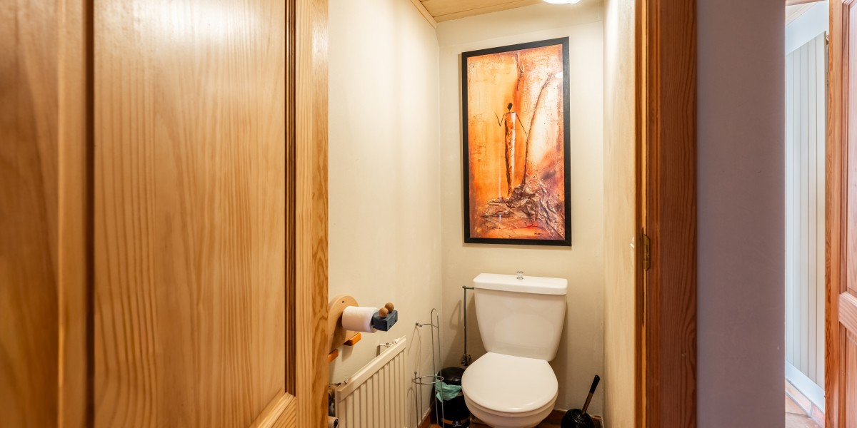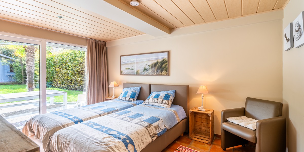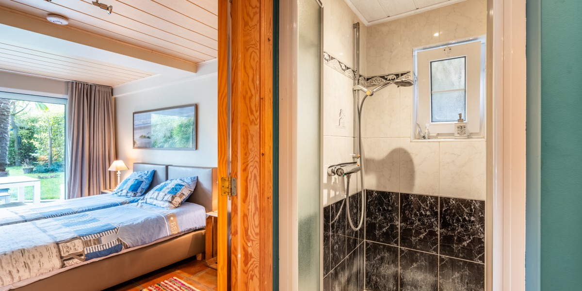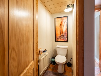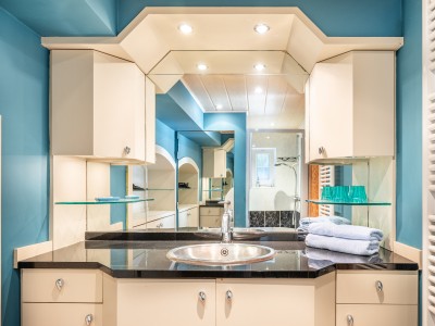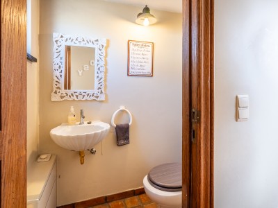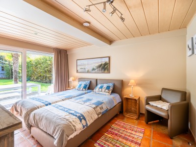 One bedroom with two single beds (90 x 200). This room gives access to the lower terrace and the garden. On this floor, there is another bathroom with a shower. Here you will also find the laundry room with a washing machine, tumble dryer, drying rack and toilet.