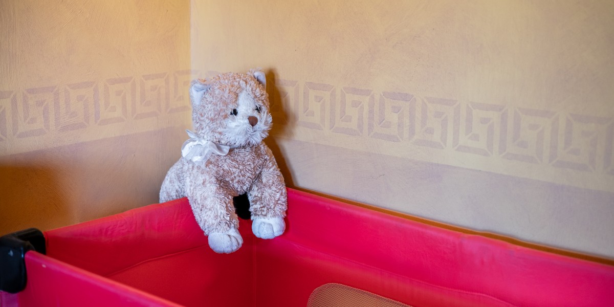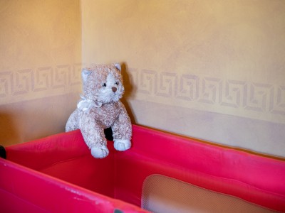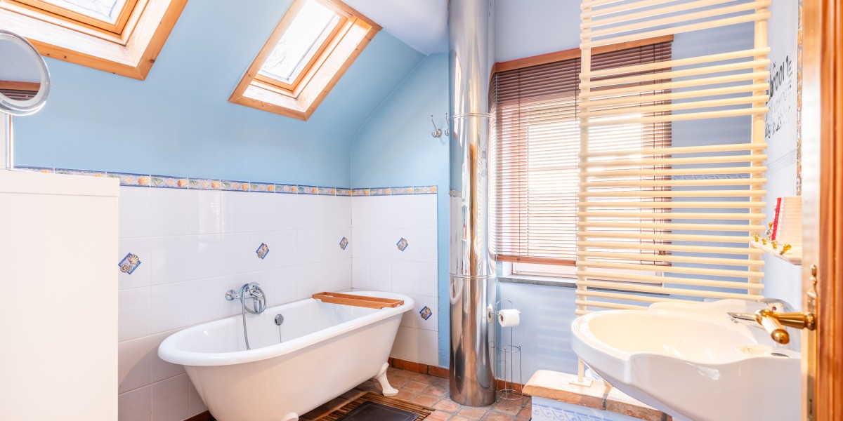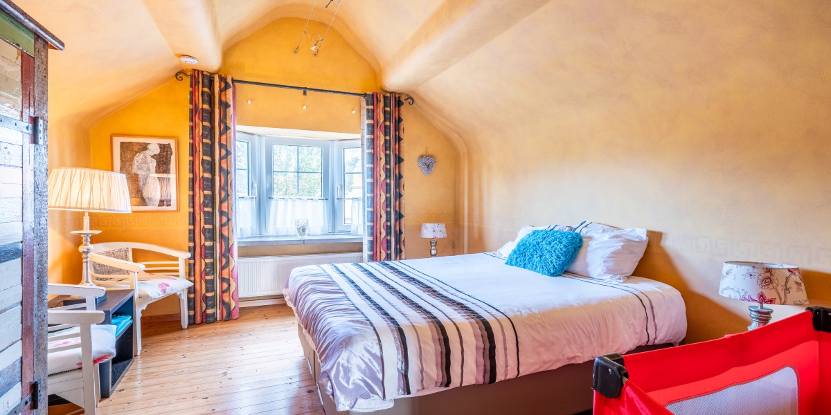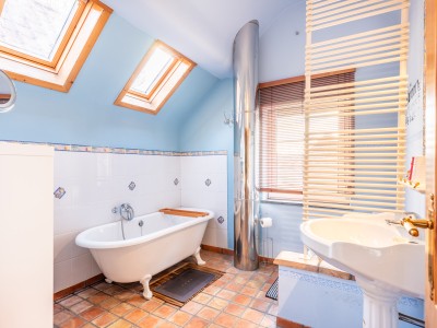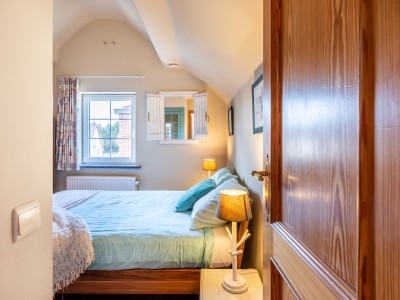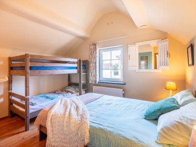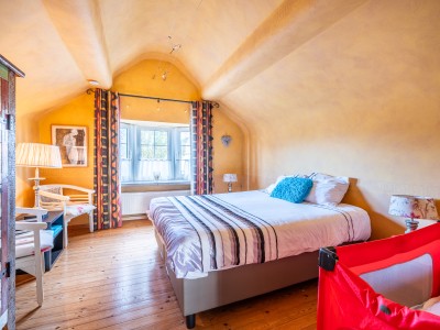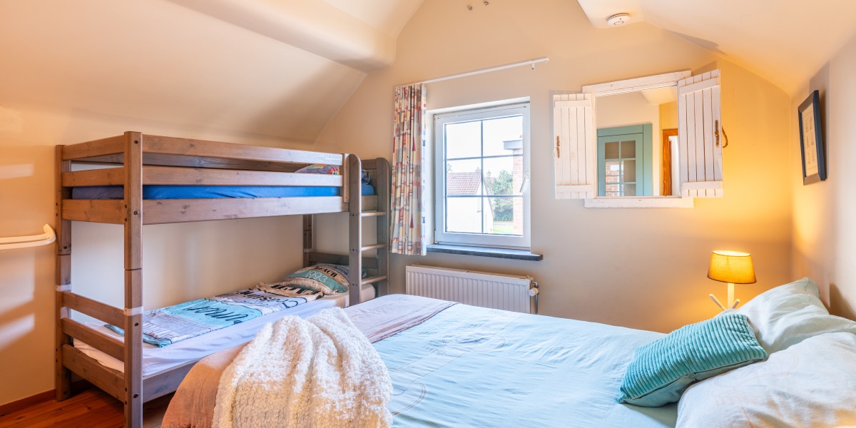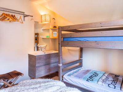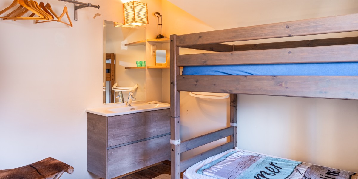Two bedrooms, one with two bunk beds (90 x 200) and a double bed (140 x 200) + one bedroom with a double bed (160 x 200). There is a bathroom with a freestanding bath, shower and toilet. It is useful to know that there is a travel cot for a baby in one bedroom.