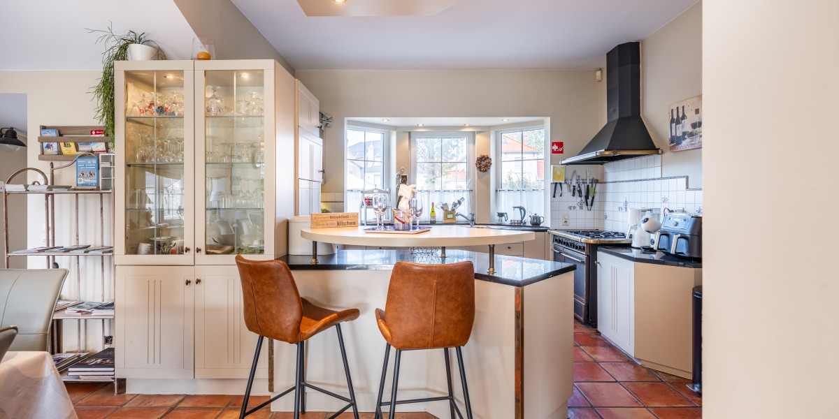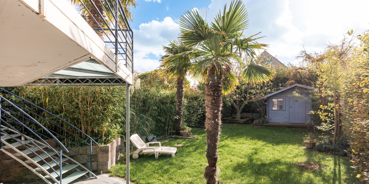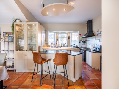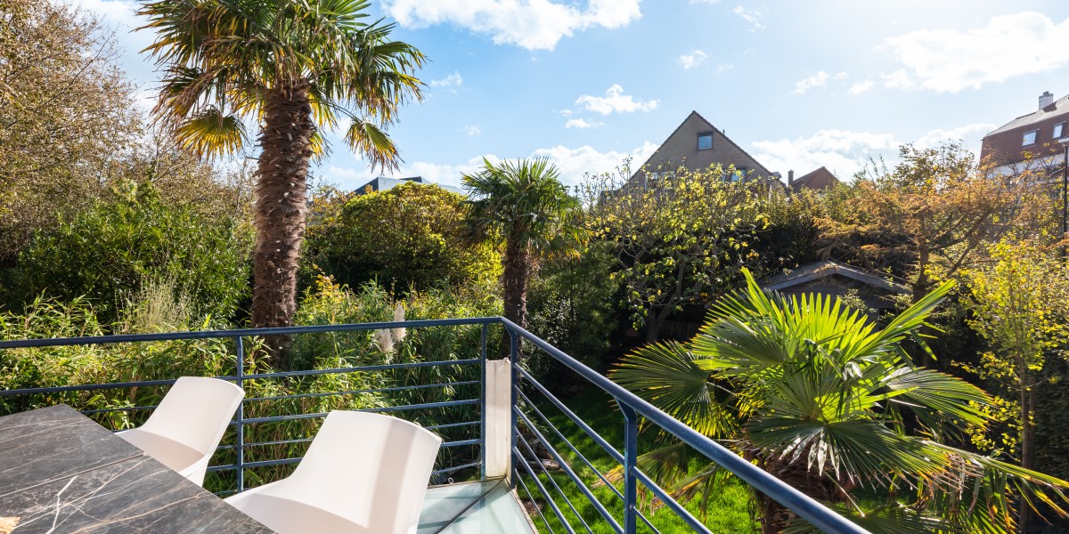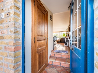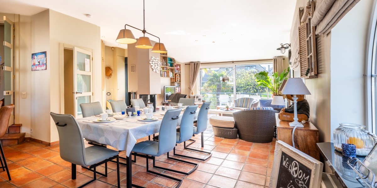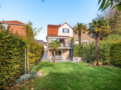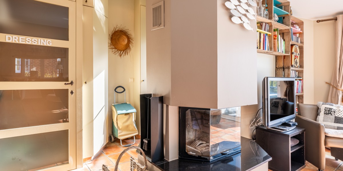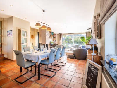 An entrance hall, toilet, 2 steps and then you are at the level of the living room with cosy wood-burning stove & access to the terrace with a view of the garden. There is also an open-plan kitchen equipped with a gas hob, microwave, fridge with large freezer compartment and dishwasher. Via the terrace with large table and 8 chairs, you can access the garden below via an external staircase.