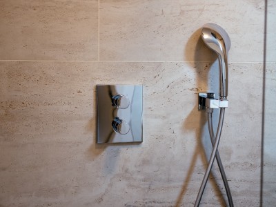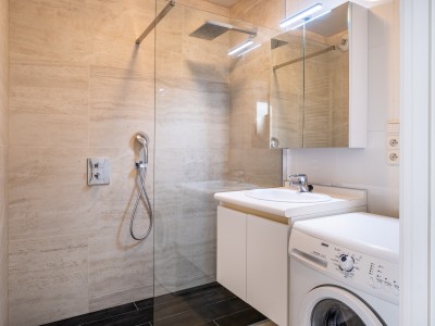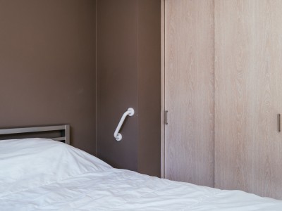 The apartment is designed for people with reduced mobility, including a raised toilet with handrails, a walk-in shower with non-slip flooring instead of a bathtub, and a bedroom with a raised bed at sitting height with a handrail.