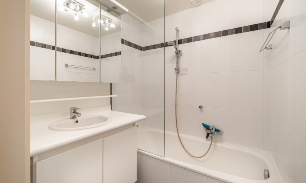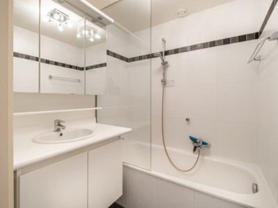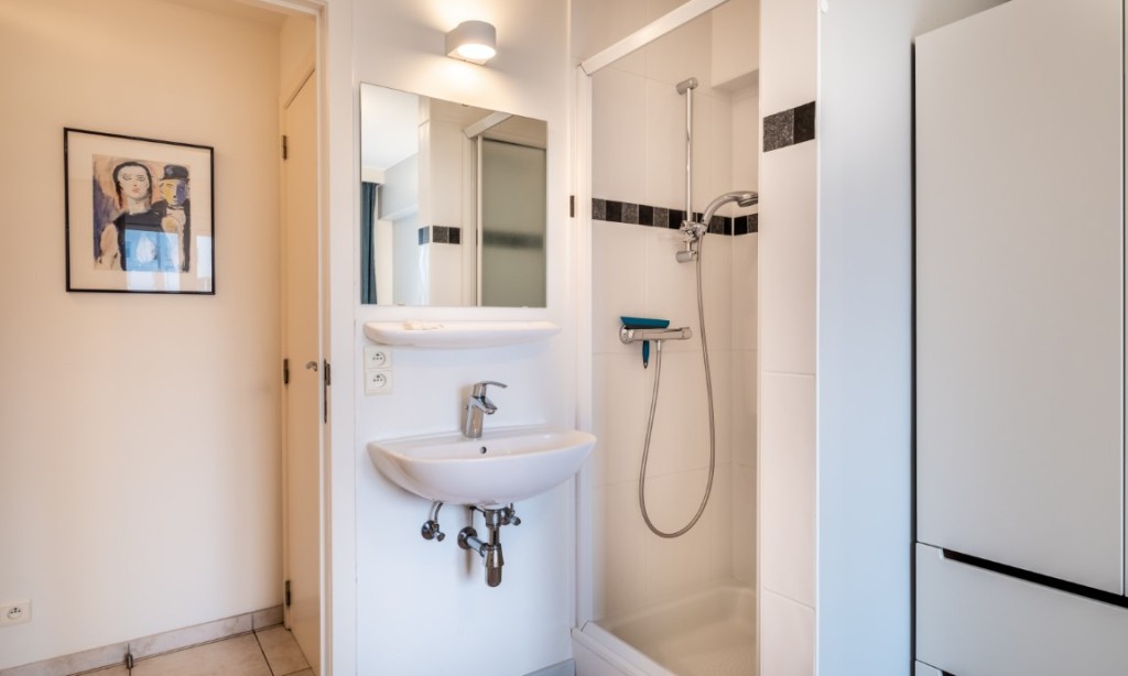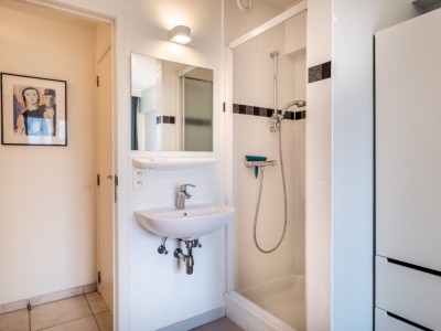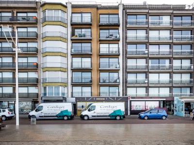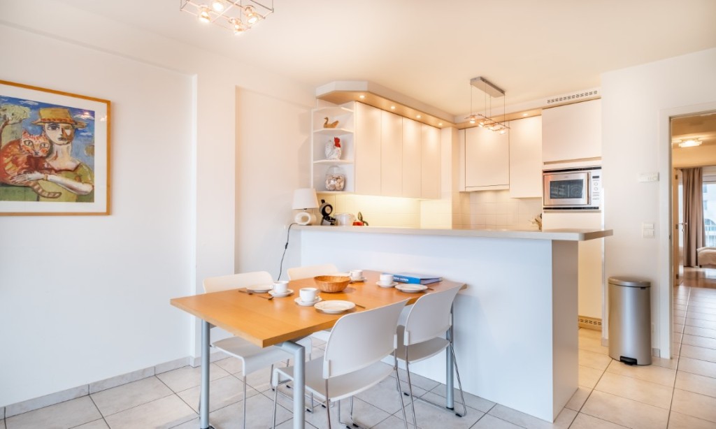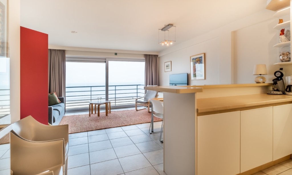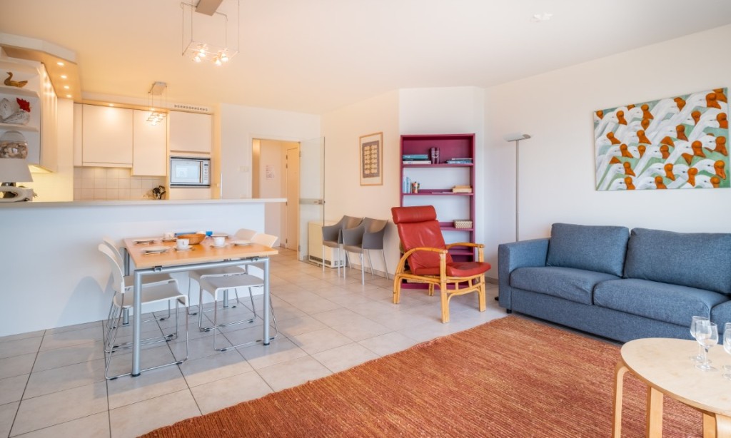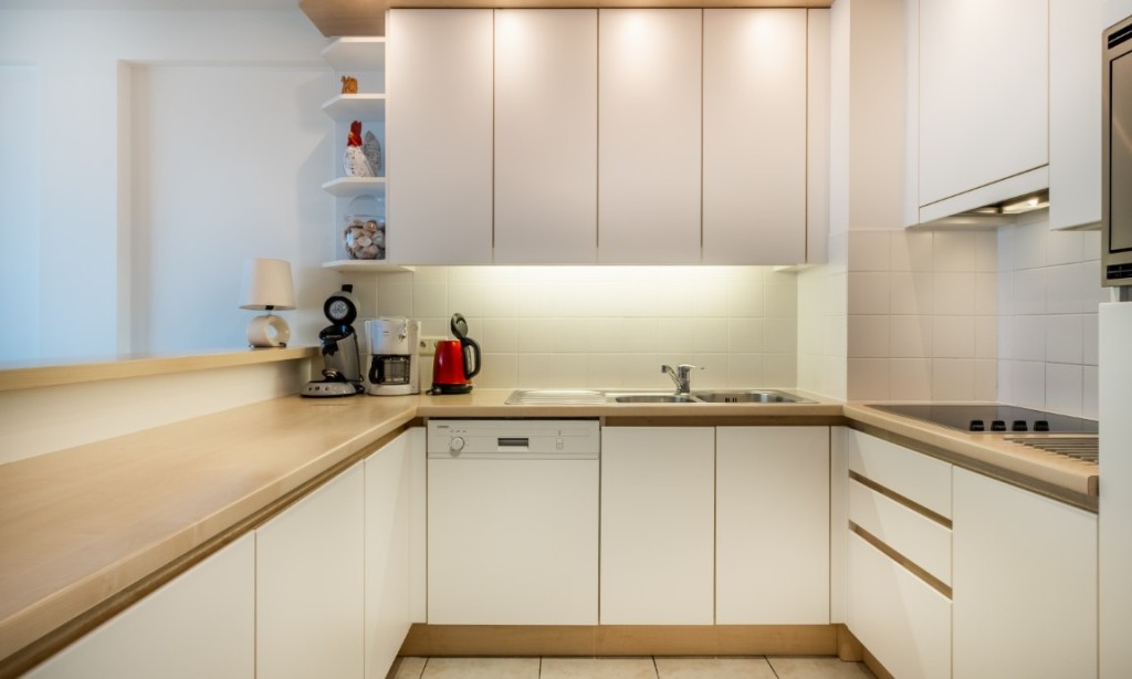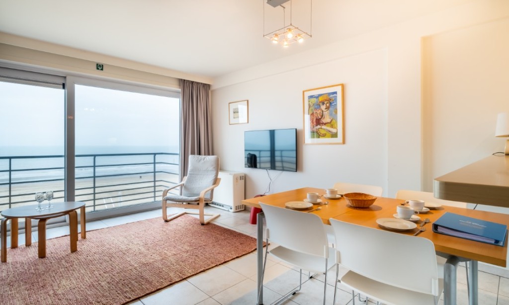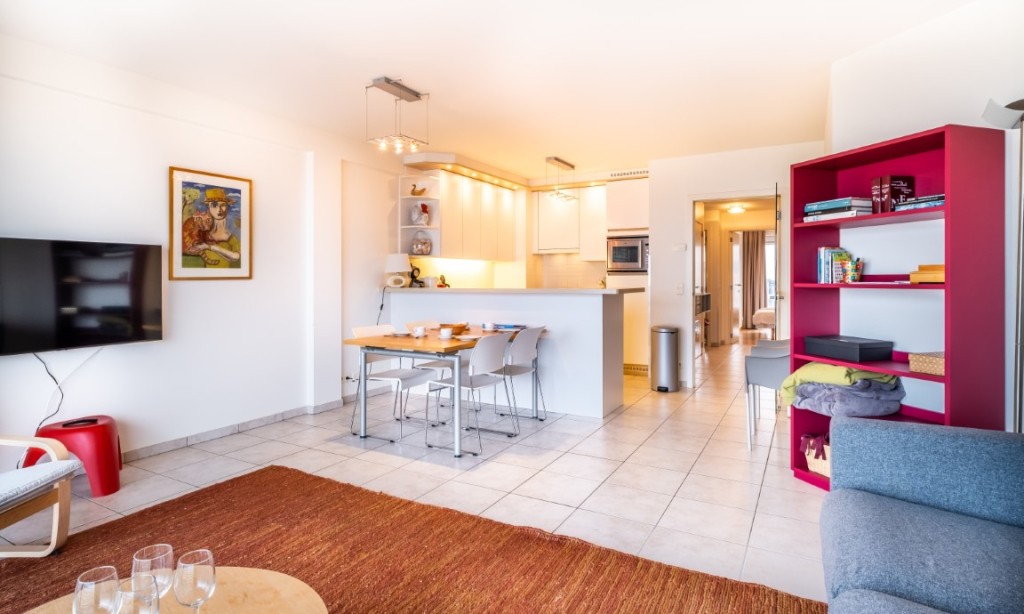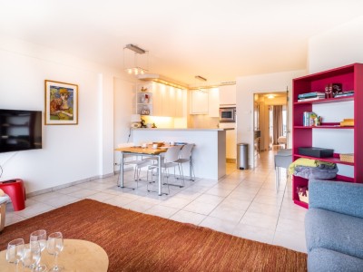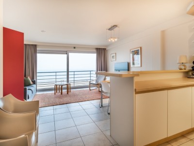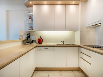 Sunny balcony at the back, comfortable balcony with sea view at the front. Modern furnished living room with open plan fitted kitchen. A bedroom with double bed and ensuite shower room. Bedroom with 2 single beds. Bathroom with bath. Separate toilet.