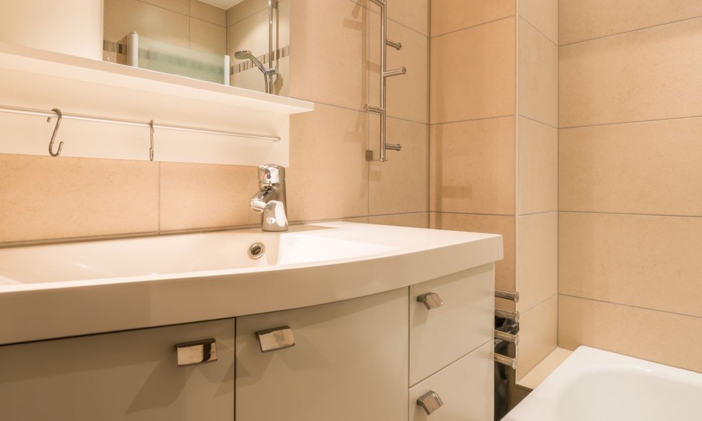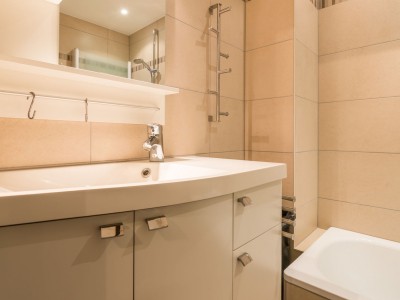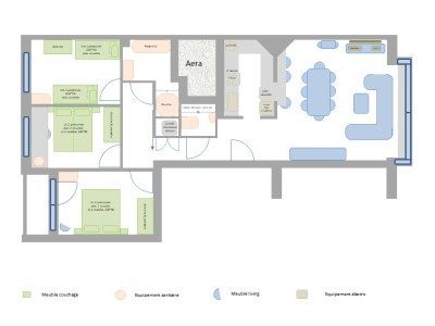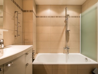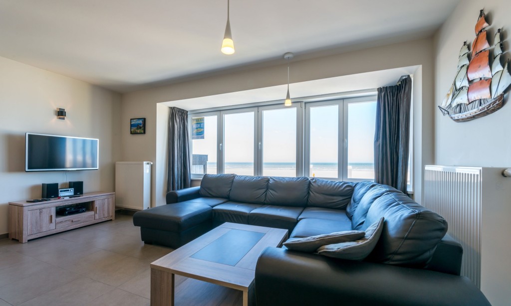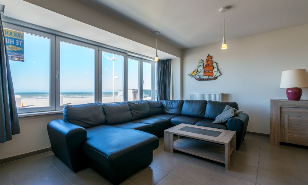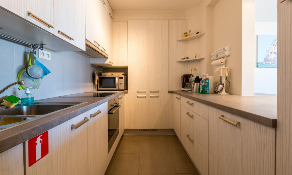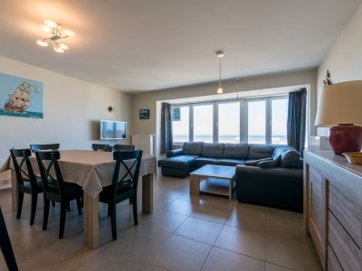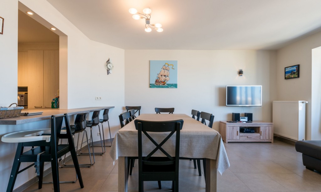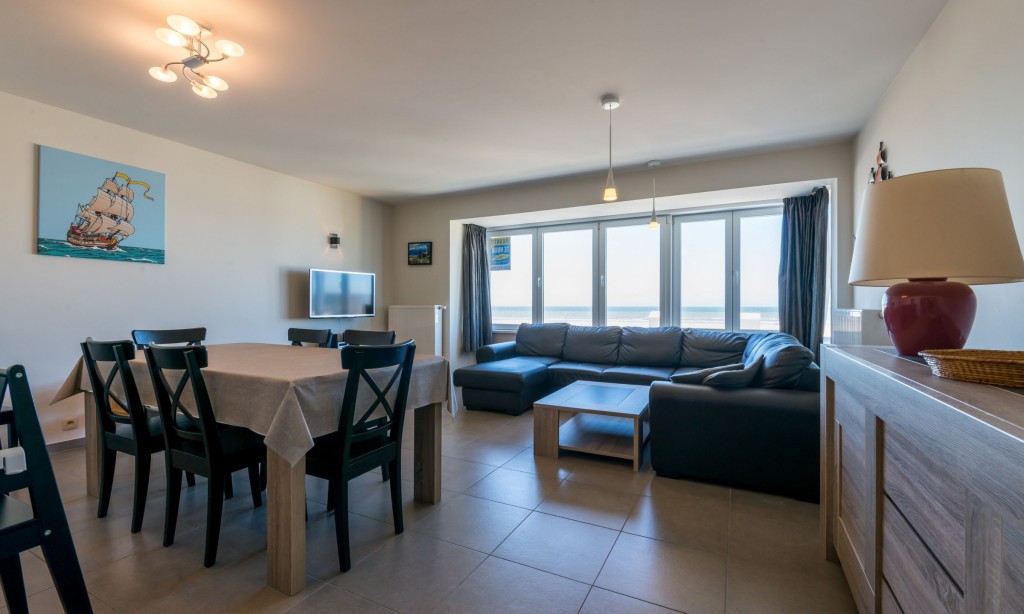 Hall, spacious living room with sea views, separate fitted kitchen, toilet, bathroom with shower and bath, a bedroom for 4 persons with 2 bunk beds (2 x 1 pers.), 2 bedrooms with a double bed.