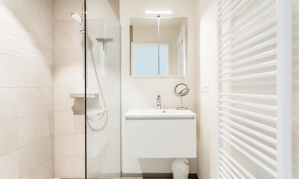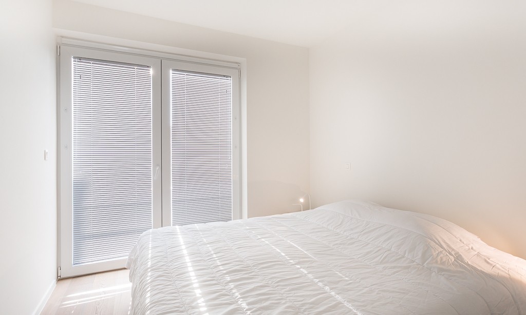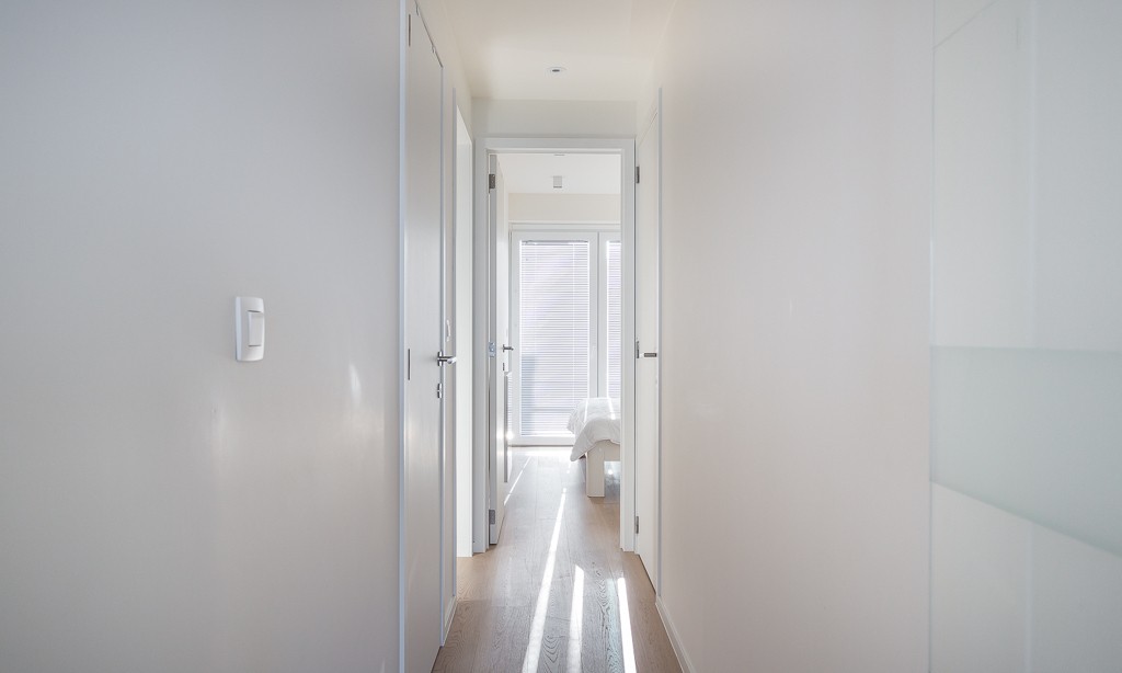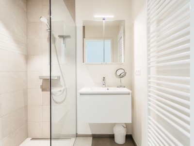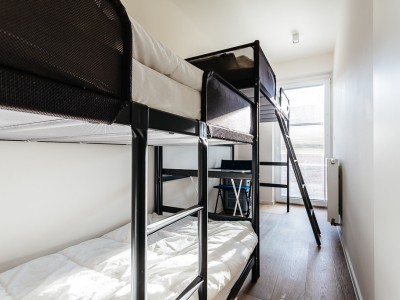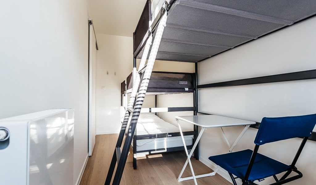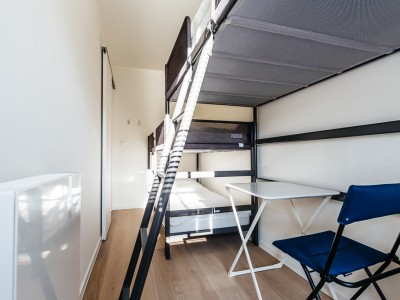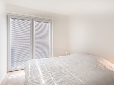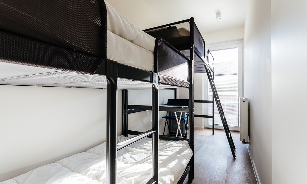 Living room with integrated, modern fitted kitchen with all comfort, bathroom with walk-in shower, separate toilet, a bedroom with a double bed, a bedroom with bunk beds and high sleeper or study place. Balcony on the sea side. Balcony to the bedrooms.